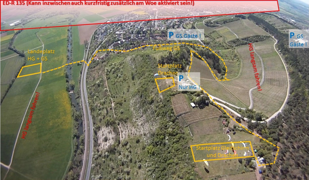 Drachenflieger dürfen aufgrund einer Ausnahmegenehmigung bis zum Startplatz fahren. Als Auflage haben wir jedoch, dass nur max. 30 kmh gefahren werden darf. Es empfliehlt sich noch langsamer zu fahren, da der Weinbergsweg von vielen Spaziergängern genutzt wird. Wenn möglich, dann Fahrgemeinschaften bilden. Auch das entlastet die Fahrbewegungen. Die Arbeiten der Weinbergsbauern dürfen nicht behindert werden. Notfalls auf den unteren Weg ausweichen.